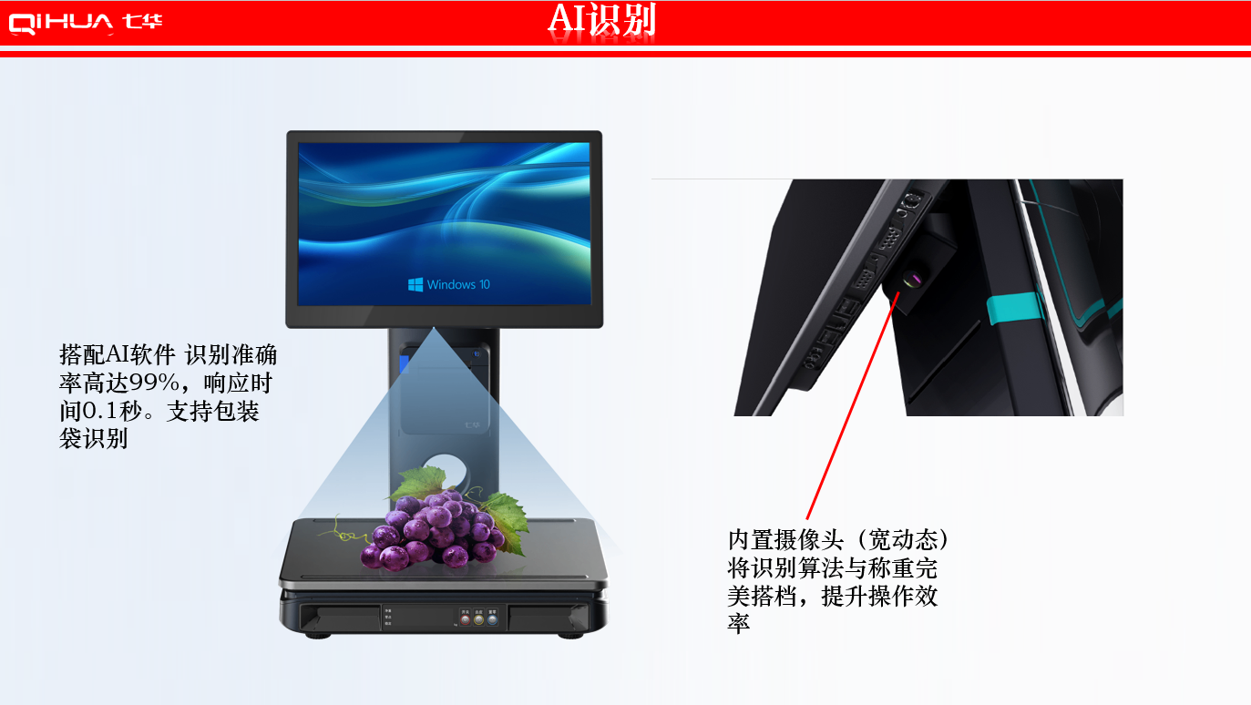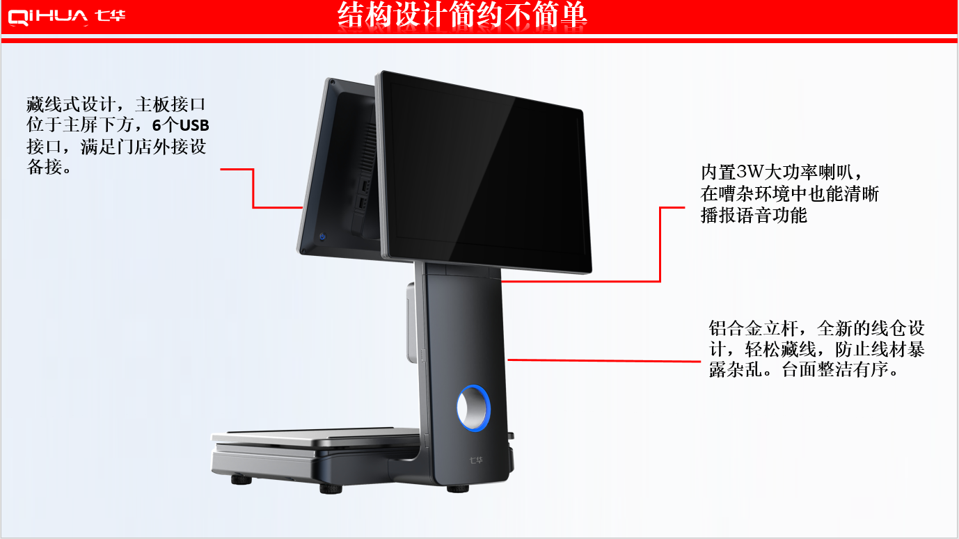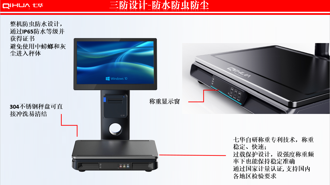 描述:新一代創(chuàng)新設(shè)計,雙15.6英寸大屏,多點式電容觸摸屏可(0~50可調(diào)節(jié)角度)。鋁合金立桿,全新的線倉設(shè)計,輕松藏線,防止線材暴露雜亂。臺面整潔有序。七華自研稱重專利技術(shù),稱重穩(wěn)定、快速;過載保護設(shè)計,設(shè)強度稱重頻率下也能保持穩(wěn)定準確;通過國家計量認證, 支持國內(nèi)各地區(qū)檢驗要求。外觀無死角設(shè)計,方便日常維修清潔。 防水防蟲設(shè)計,輕松應(yīng)該對農(nóng)貿(mào)市場等惡劣環(huán)境。